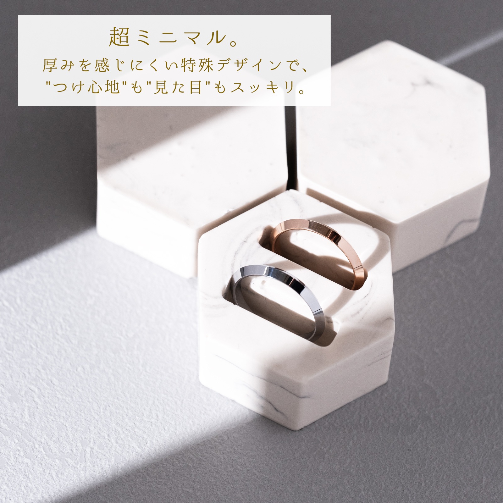 エッジが印象的なシンプルデザインとなっています。全体的にエッジ以外の部分は厚みが薄い形状ですので、隣の指に当たる違和感を感じにくいつけ心地です。メンズのカラーはシルバー色のみとなりますが、レディースは「シルバー色 / ピンクゴールド色」の2色からご選択頂けます。