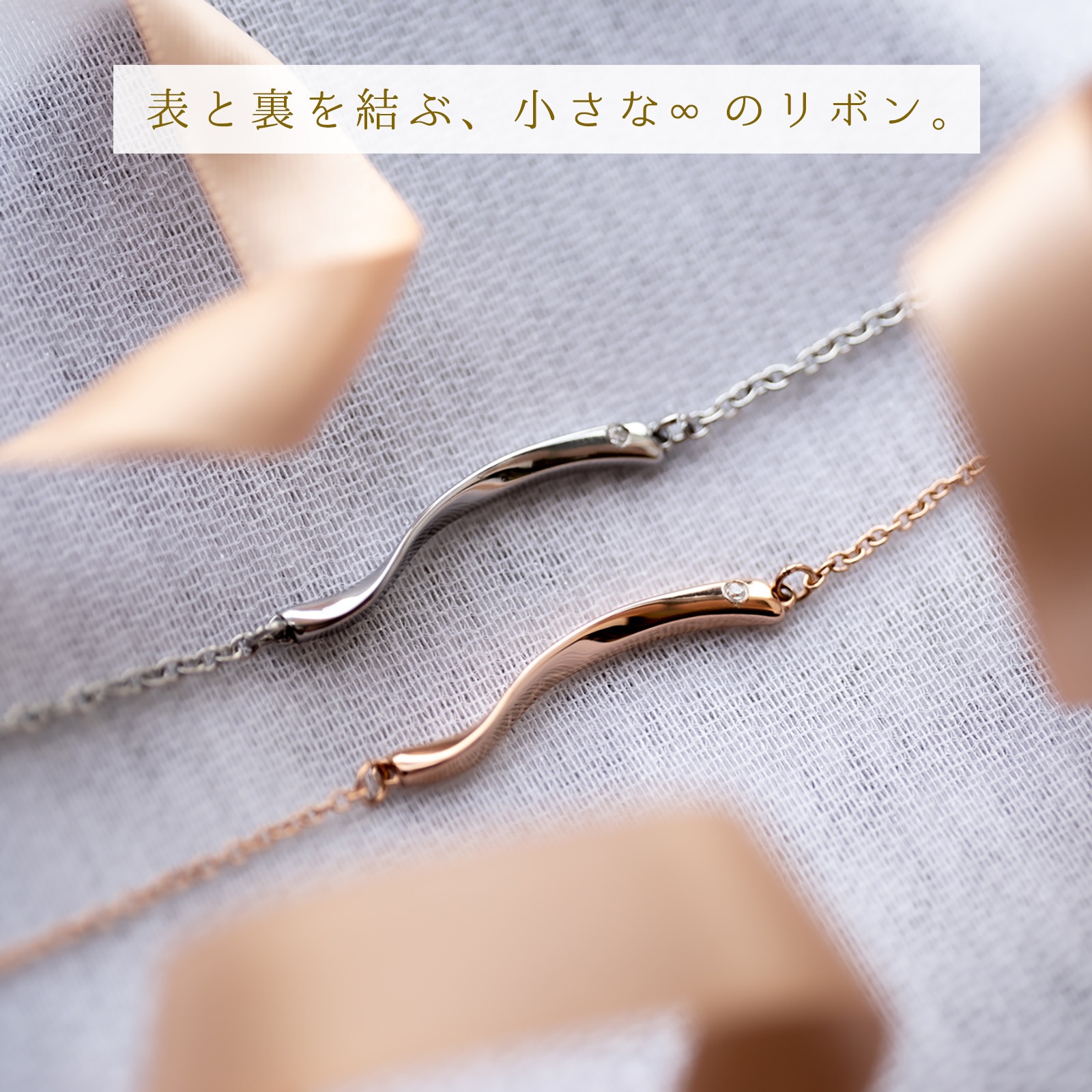 メビウスの帯をモチーフとしたメインパーツに小さなジルコニアを一粒あしらった、ステンレス製のペアブレスレット/アンクレットです。